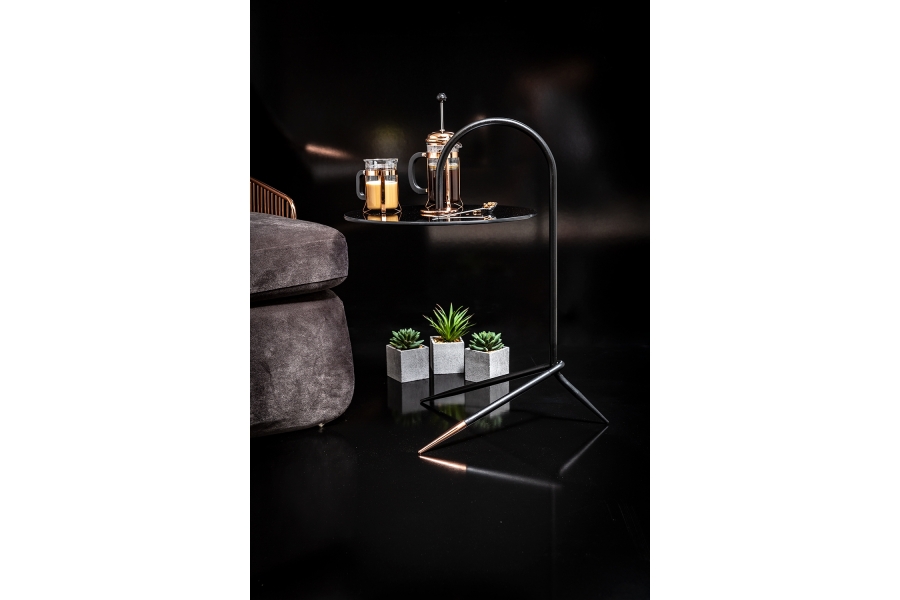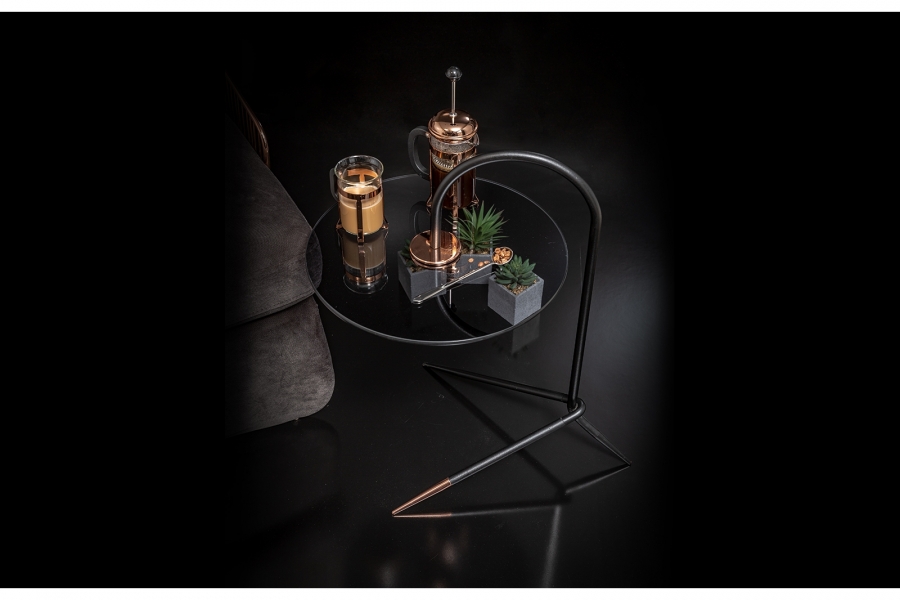 A single support side table that adds unique look to your living. TEMPERED GLASS, BRONZE COATING SHOES, ELECTROSTATIC METAL FOOT