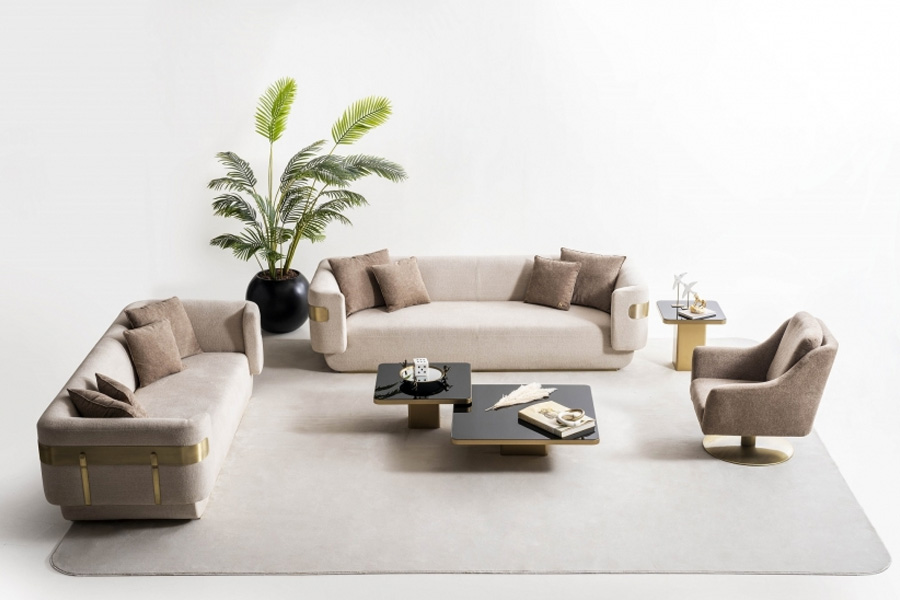 A curved luxury Piece made with the most comfortable foams and wrapped with Gold metal gloss it reveals itself with prominent luxury and comfort that lights up your living experience