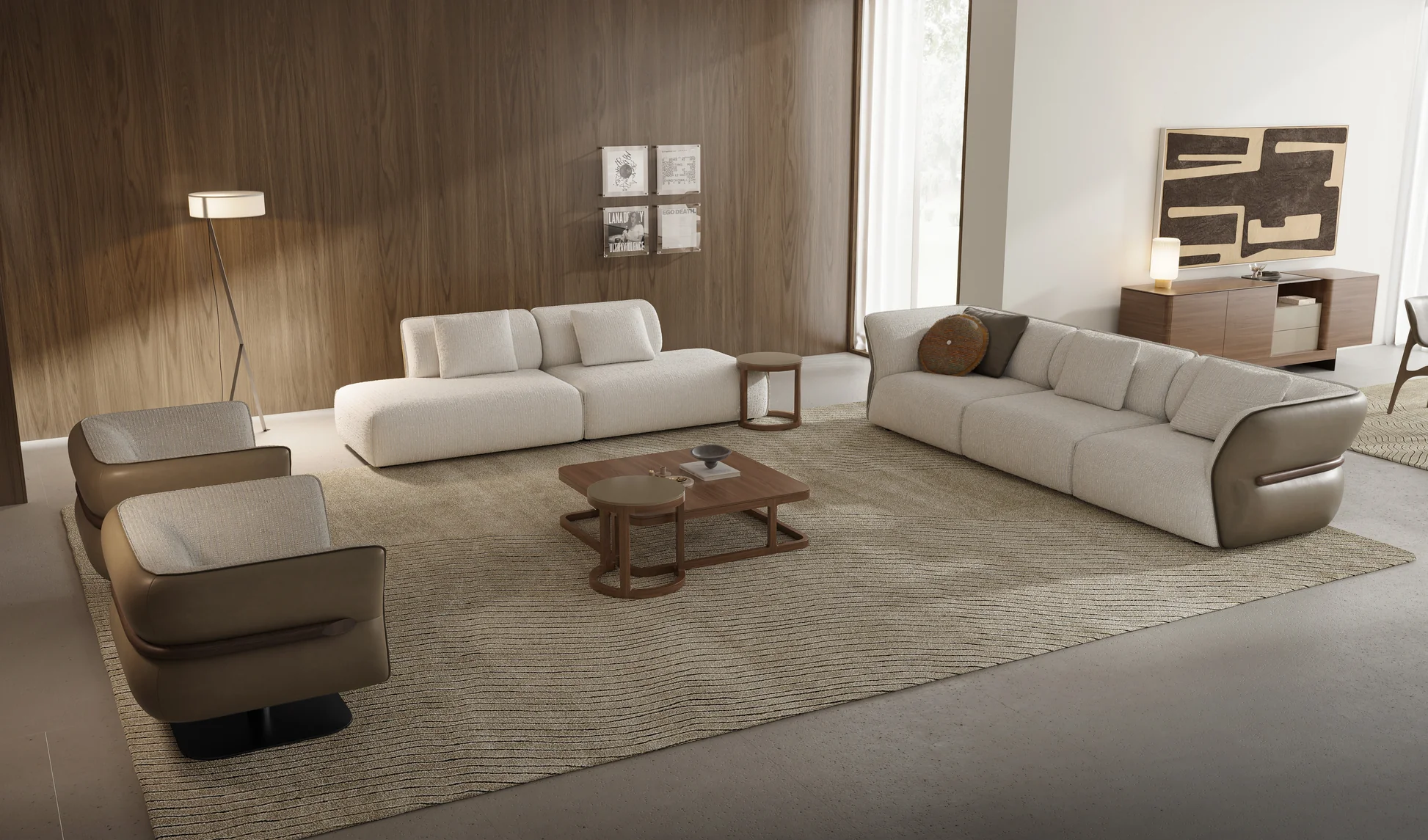 Its sleek geometry and tactile mix of leather and fabric redefine comfort for the contemporary home. Rearrange it into cozy corners or wide, social settings its form always feels intentional, like it was meant for that exact space.