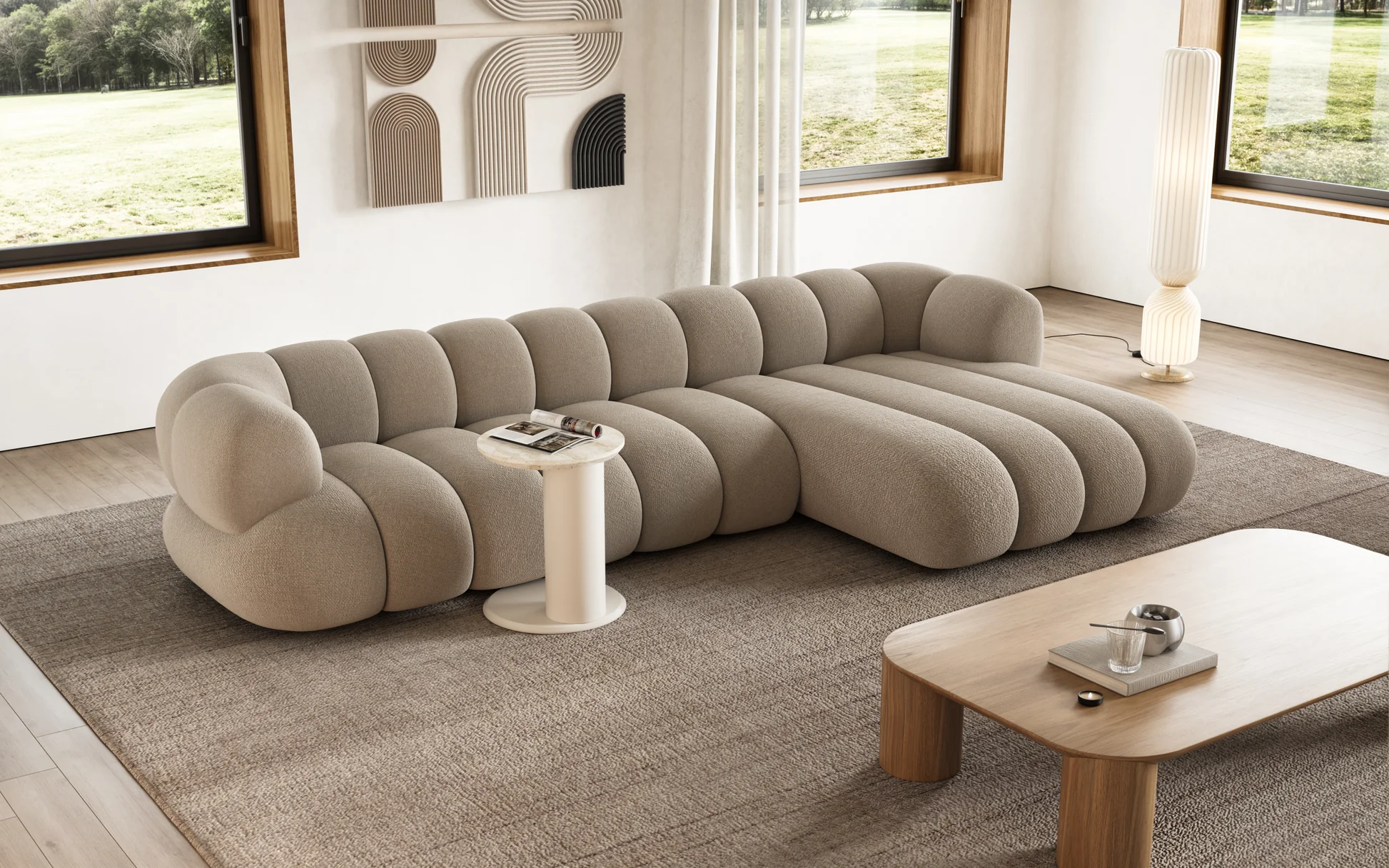 A seamless blend of softness and structure, the Lia Sofa embodies modern comfort with sculptural elegance. Its flowing curves and cloud-like form invite you to unwind, while the plush upholstery adds warmth and refinement to any living space.