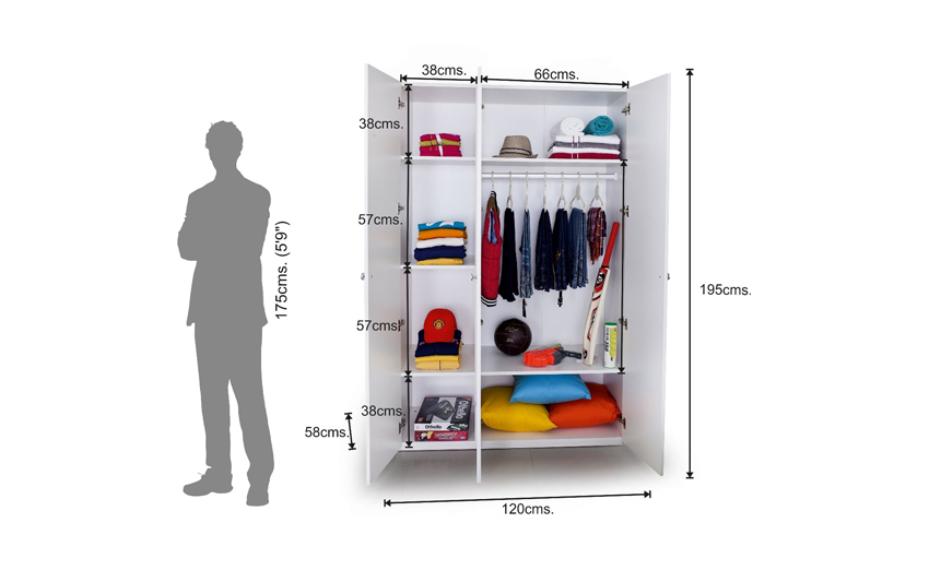 This three-door wardrobe designed in soft pastel tones, not only provides ample storage but also adds a soft, soothing comfort to your child. Inside, the wardrobe is split into two sections - behind the double doors is a hanging rail with two shelves. While the single door hides four shelves that are great for toys, shoes, folded clothes and more.