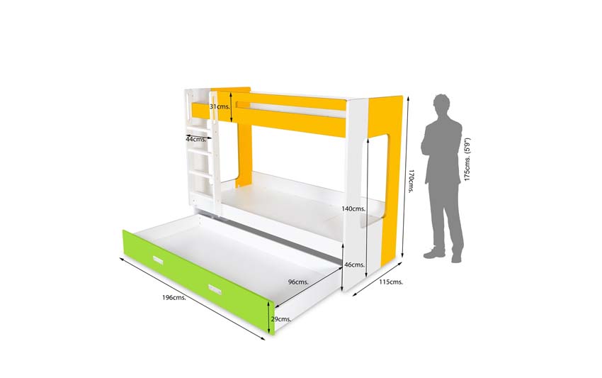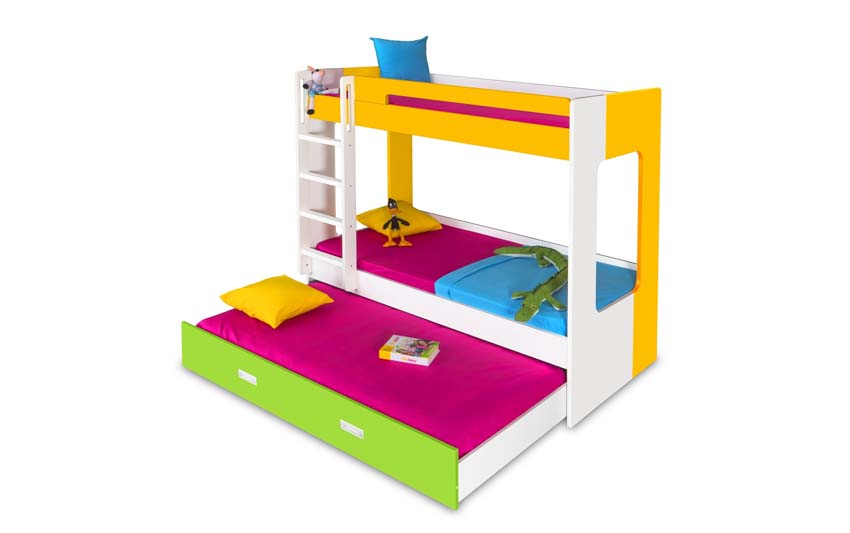 This wooden three sleeper bunk bed, is a contemporary design, and one of its kind. With its clean lines and no fuss design, this is a sleek addition to any bedroom. A 3 ft. width bed and a pull-out trundle bed (3 ft. width) below make it ideal space saver for your children. Trundle bed can also be used for srorage purpose.
