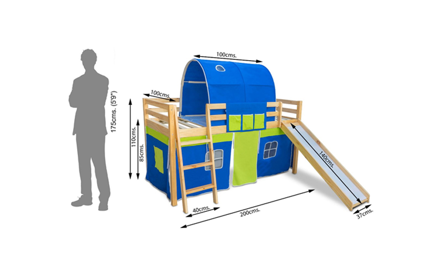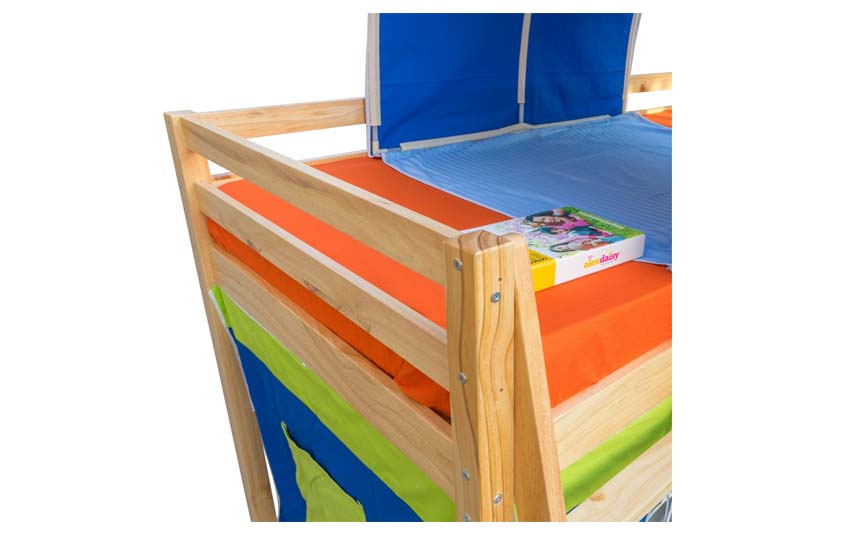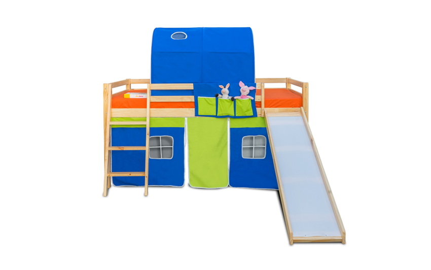 Bedtime becomes fun time with this Mid-sleeper bed with a slide. Your kids can have a blast climbing up the bed and sliding down. Features a loft bed with a tent, tower and a fun slide in colourful combinations. The cozy tent area below the loft bed can be used for play time, or for storage or can even place another mattress over there for sleeping.