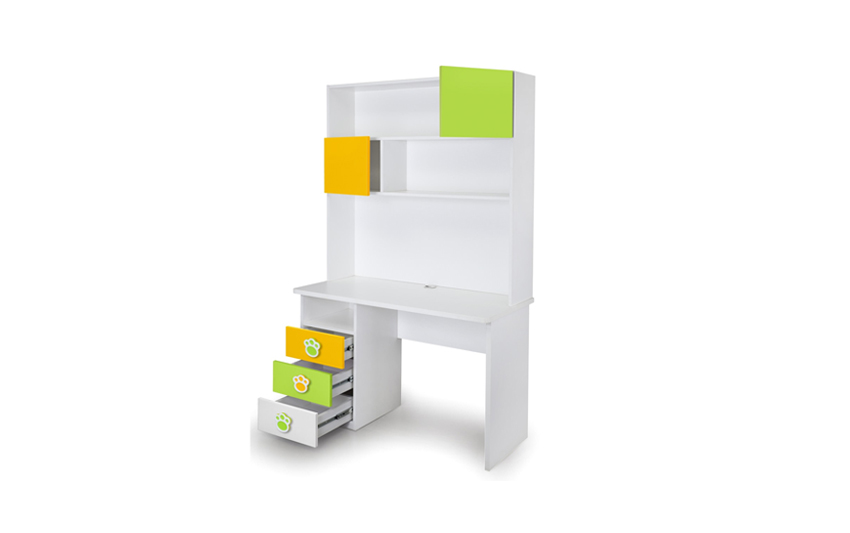 Sturdy student desk with a versatile finish. The desk features three drawers with paw-shaped knobs. Has an extra hutch consisting of two shelves to arrange books neatly or display decoratives.Timeless design with space for a desktop or a laptop.