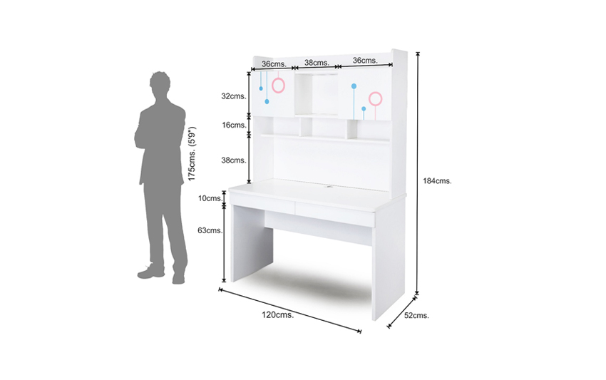 This desk in white offers a sleek styling for your child’s room. Two spacious drawers provides plenty of useful storage space to keep stationary and accessories in order. Comes with an additional hutch on the top which features two flip doors decorated with a graphic design and various small cubbies to arrange your child’s trophies or decoratives.