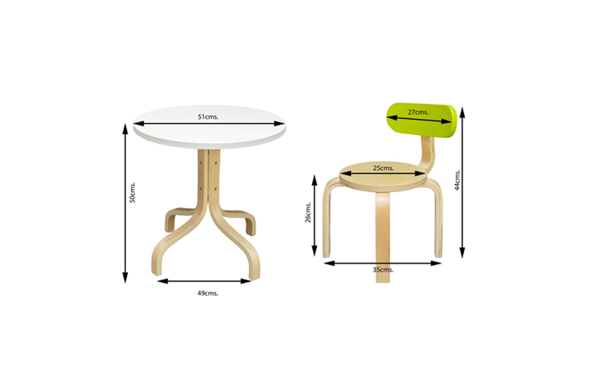 A smart set of colourful two chairs with a rounded base and a sleek back complemented with a round table. Superbly designed for creative kids who love sharing their special space with their friends. Made of top grade American beech wood, the entire set is durable and long-lasting. Ideal for lunch for two, studying or for doing art projects, playing board games or story time.