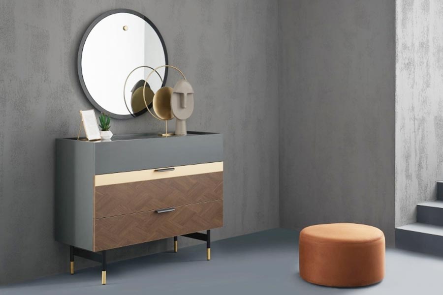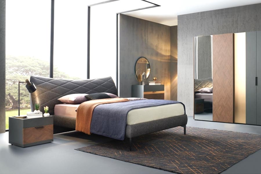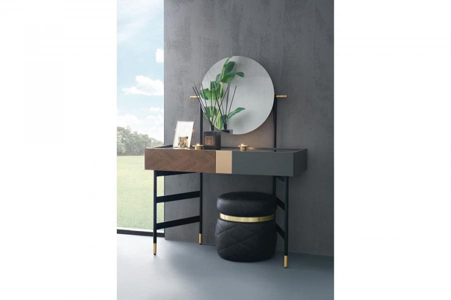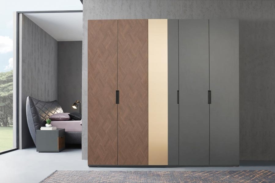 Enriching the natural aesthetics of wood with multi-material combinations, DORIAN BEDROOM creates a stylized space with its eye-catching design and functional features. Parquet surface patterns accompanying the gold and matte gray color combination leave a stylish and refined effect in bedrooms. In addition to 5-door wardrobe alternatives, 2 different hybrid wardrobe modules, both with doors an