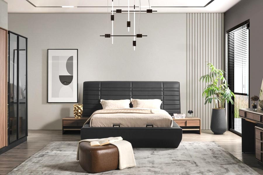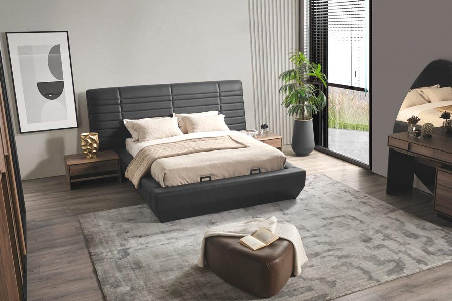 Introducing the Bronze Bed - a premium modern bed that combines style, functionality, and comfort. Made with the finest materials, the Bronze Bed is constructed with a sturdy walnut wood and metal frame that provides both stability and durability. The bed's headboard and footboard are upholstered in luxurious vegan leather, which not only looks great but also provides a comfortable backrest