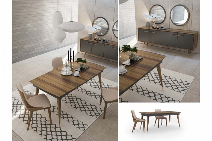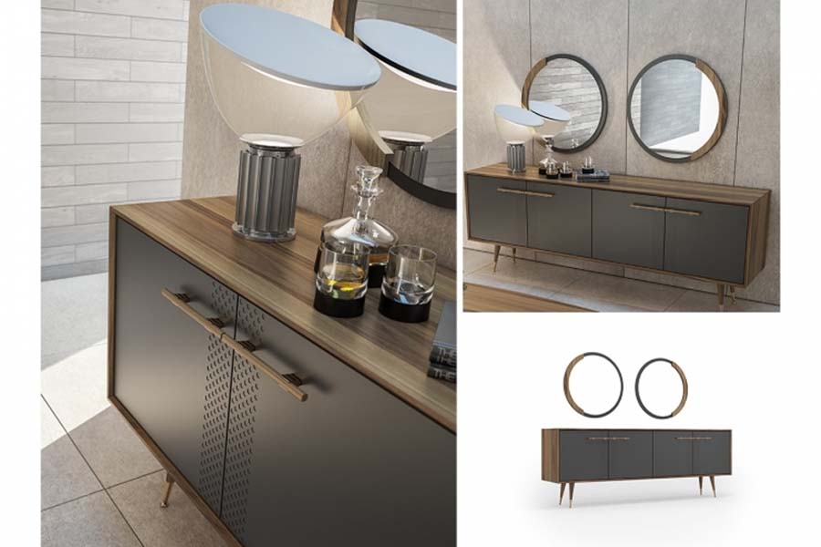 The console of the Alvin Dining Room with its natural walnut wood veneer body takes on a nice silhouette with paint and CNC engraved patterns; Metal material is preferred on the parts of the wooden legs that touch the ground.
